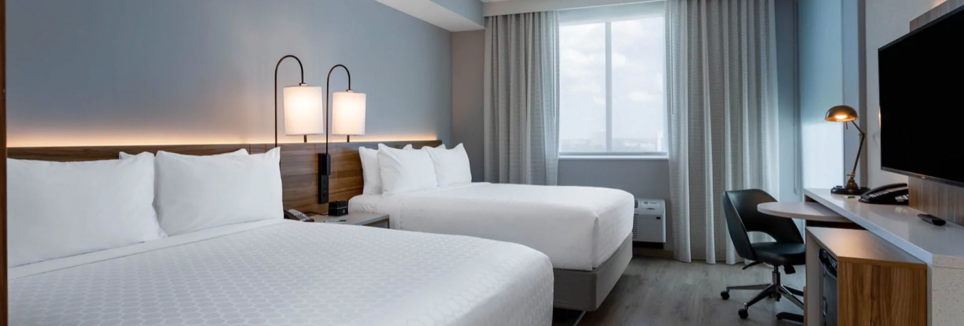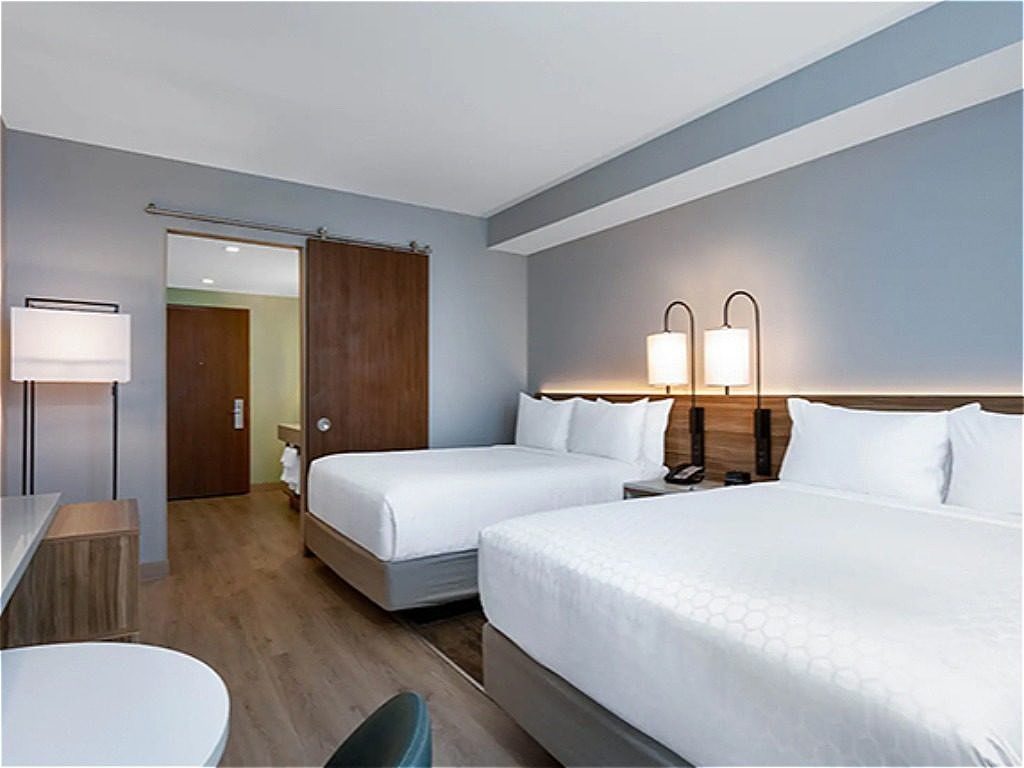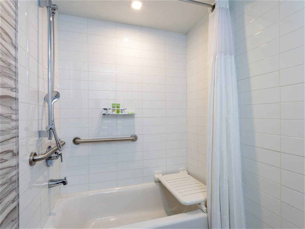 NON SMOKING MOBILITY ACCESSIBLE 2 QUEEN BEDS. ROLL IN SHOWER, FREE WIFI, MINI FRIDGE Relax in our 2 queen bed non-smoking mobility/hearing accessible guest room. Accessible amenities include a roll in shower, wider doors, adjustable handheld shower wand, shower seat, accessible door viewer, additional bathroom grab bars, subtitles/closed captions available on TV and lowered closest. Additional amenities include complimentary high-speed wireless internet access, comfortable work area, ergonomic Emma Chair, flat screen 50 HDTV, safe and mini-refrigerator.Room Details and Accessible Amenities
